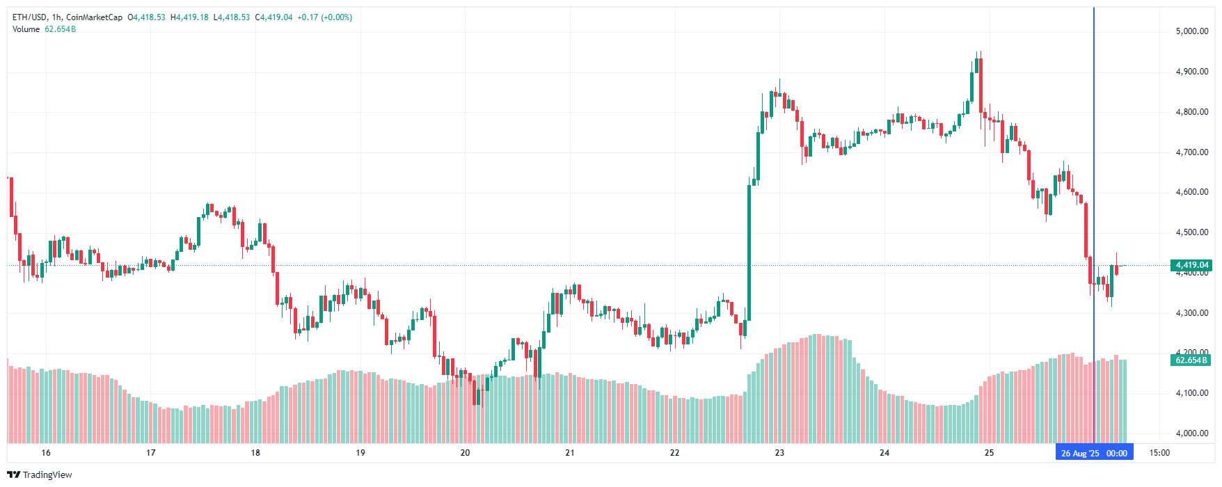 Вторая по капитализации криптовалюта Ethereum начала день с бокового движения. На момент написания обзора, монета торгуется по $4 419 (1 токен в рублях — ₽357 640).
