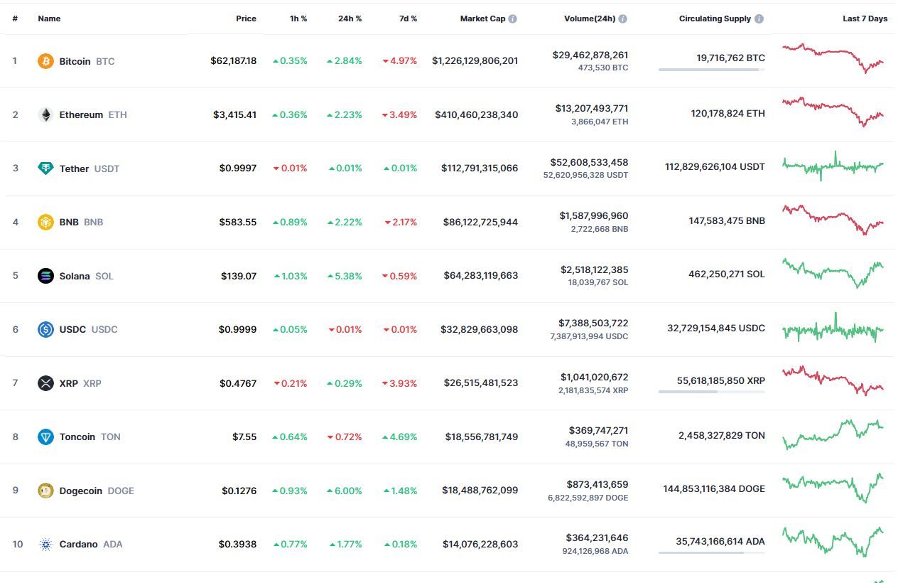 Биткоин (BTC), по данным ресурса TradingView, начал среду с бокового движения. По состоянию на 05:29 (МСК), криптовалюта торгуется по $62 266 (1 токен в рублях — ₽5 441 726). Минимум биткоина за 24 часа — $60 612, максимум — $62 466.