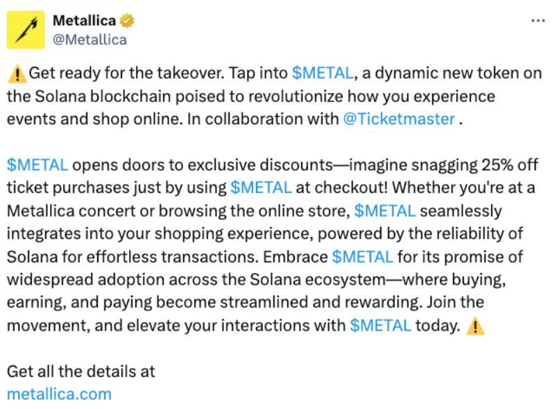 Хакеры анонсировали токен METAL, якобы запущенный в партнерстве с компанией по продаже билетов Ticketmaster. Однако представители организации не делал никаких официальных заявлений.