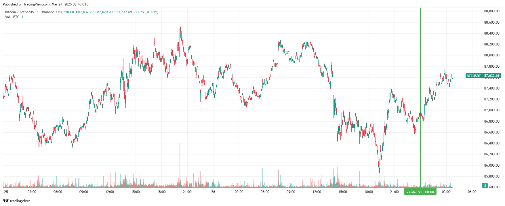 Биткоин (BTC), по данным ресурса TradingView, начал четверг с роста. По состоянию на 06:47 (МСК), криптовалюта торгуется по $87 632 (1 токен в рублях — RUB 7 370 028). Минимум биткоина за 24 часа — $85 861, максимум — $88 292.