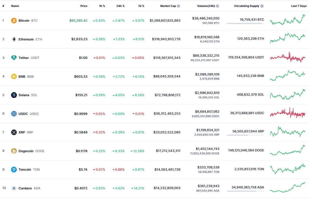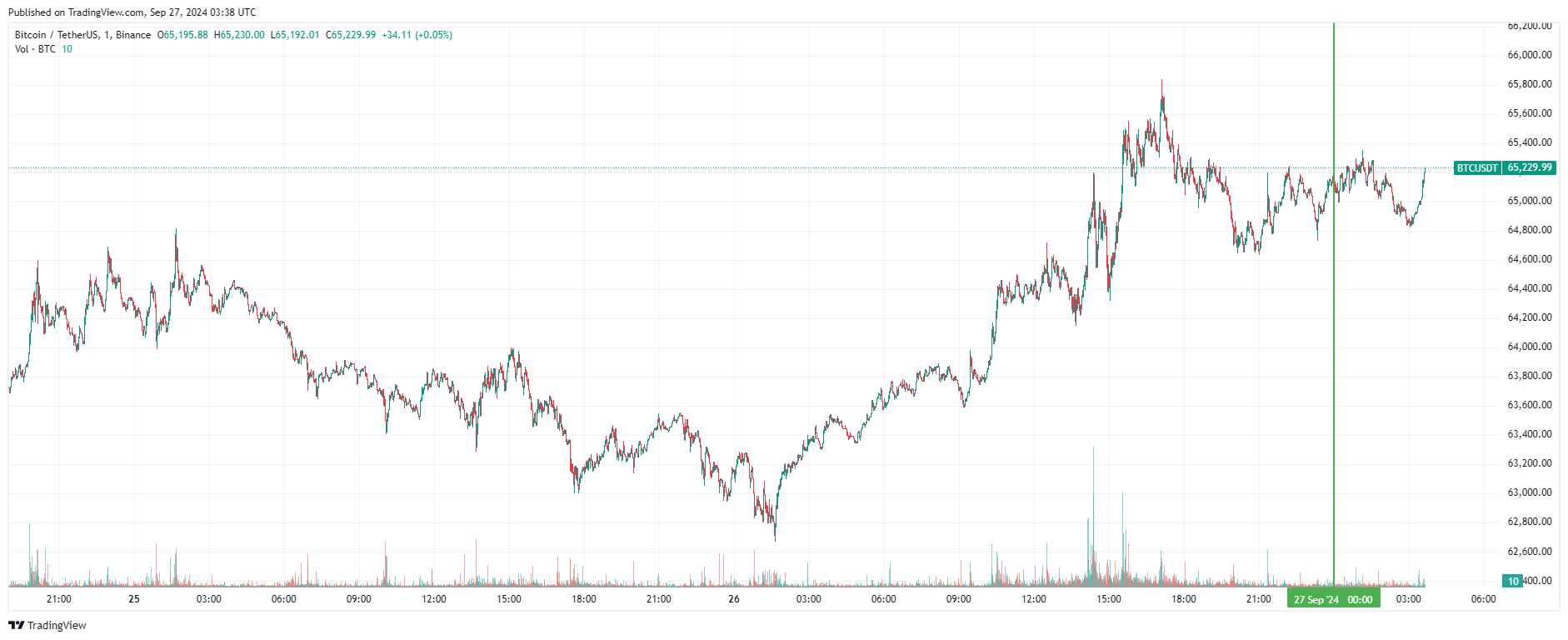Биткоин (BTC), по данным ресурса TradingView, начал пятницу с бокового движения. По состоянию на 06:39 (МСК), криптовалюта торгуется по $65 229 (1 токен в рублях — ₽6 032 727). Минимум биткоина за 24 часа — $63 292, максимум — $65 790.