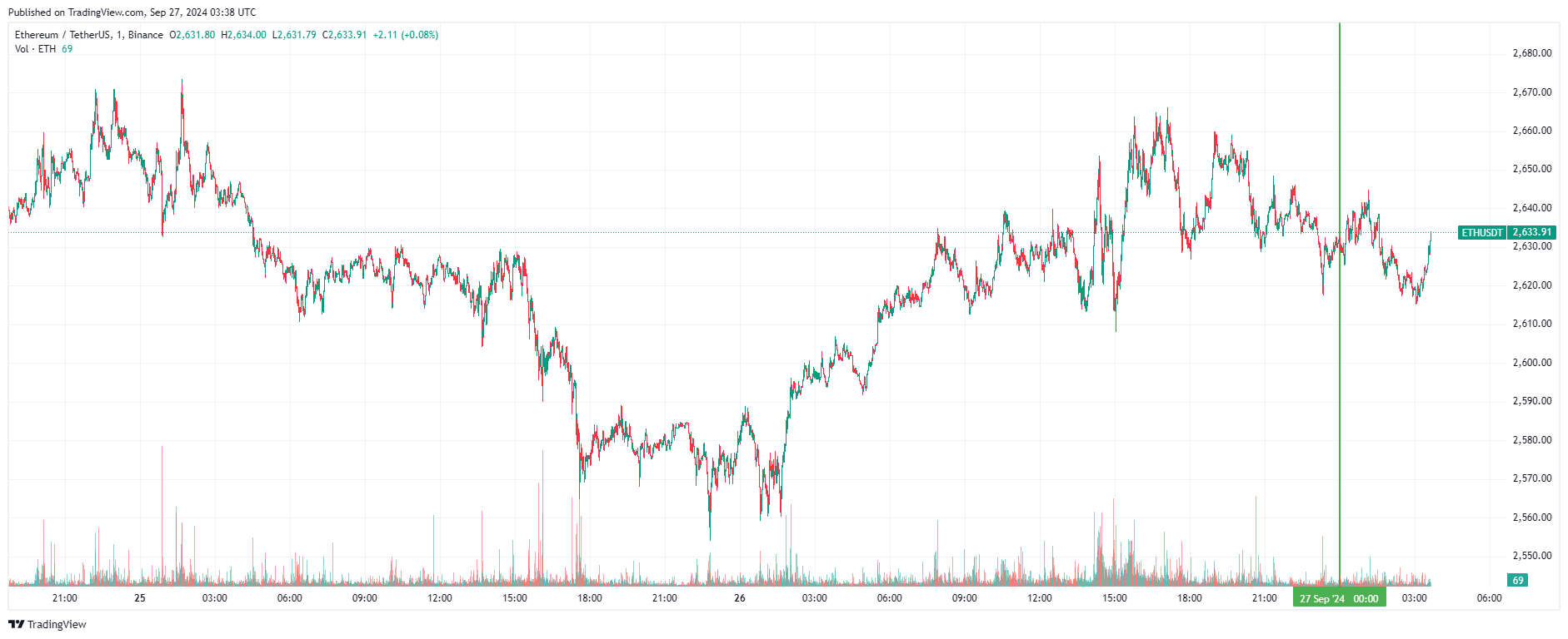 Вторая по капитализации криптовалюта Ethereum также начала день с боковика. По состоянию на момент написания обзора, монета торгуется по $2 633 (1 токен в рублях — ₽243 415).