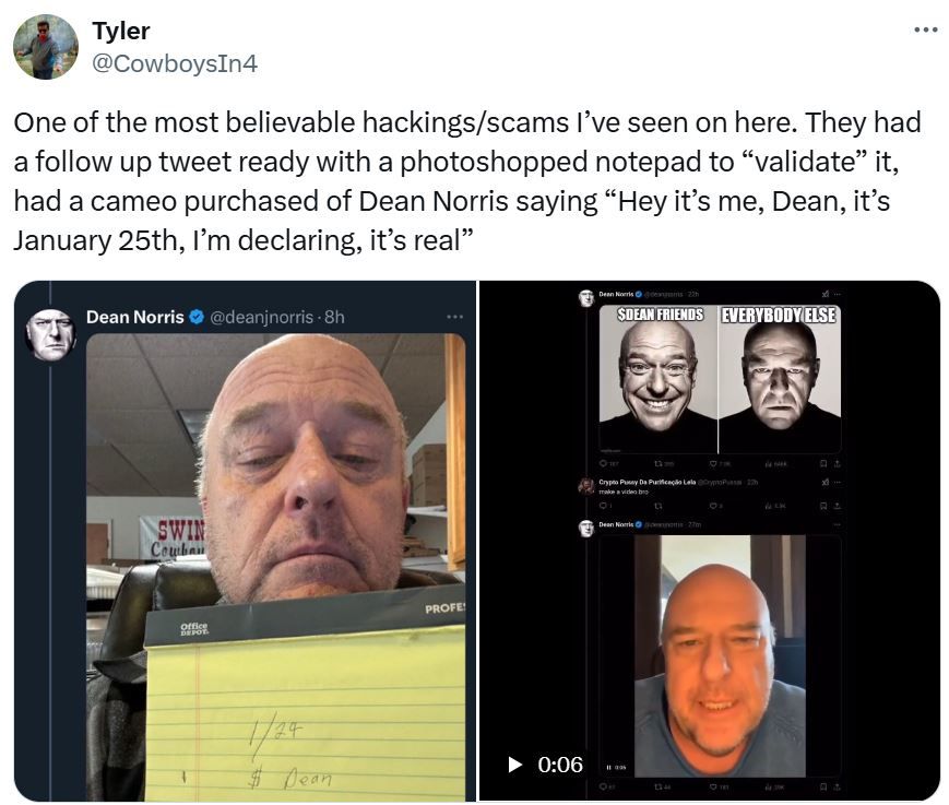 Хакеры разместили в аккаунте поддельные посты, включая видео, где Норрис якобы поддерживает мемкоин. Некоторые пользователи думают, что видео могло быть дипфейком. Участники криптосообщества считают, что это один из самых продуманных и правдоподобных скамов.