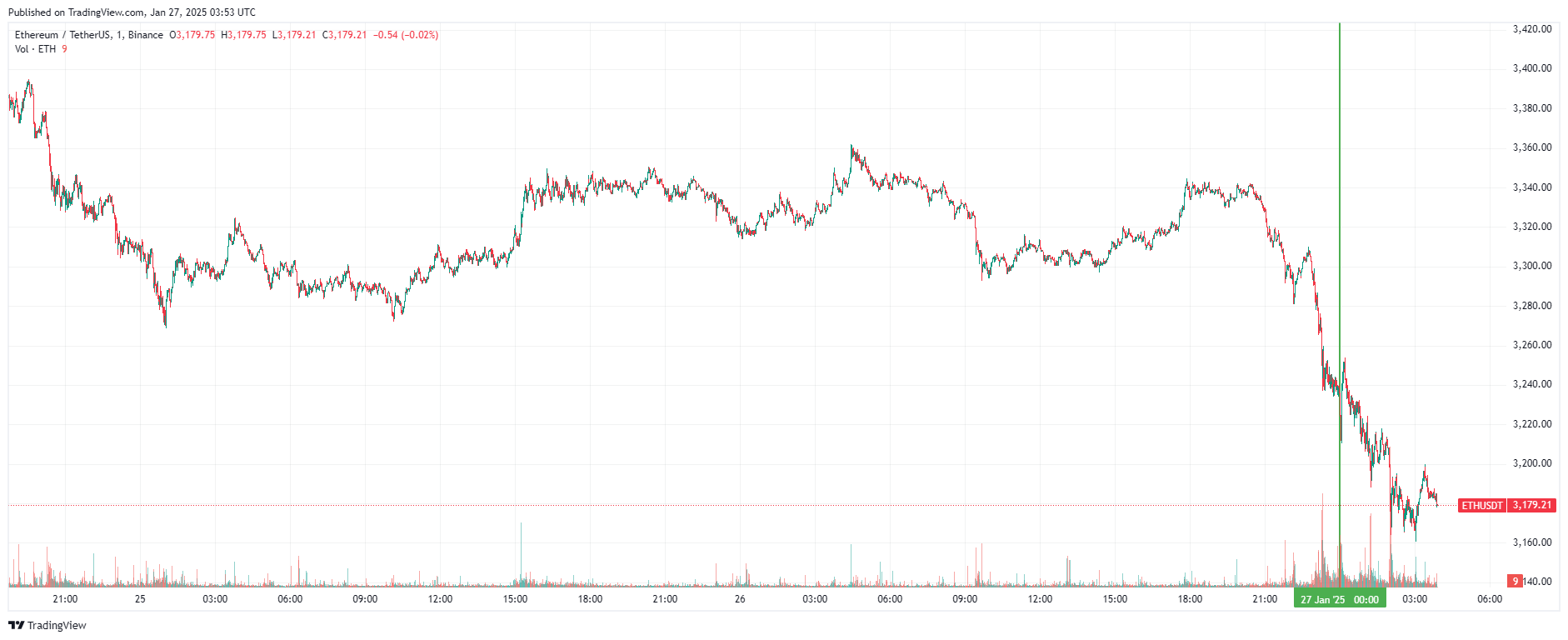 Вторая по капитализации криптовалюта Ethereum также начала день с падения. На момент написания обзора монета торгуется по $3 179 (1 токен в рублях — ₽312 467).