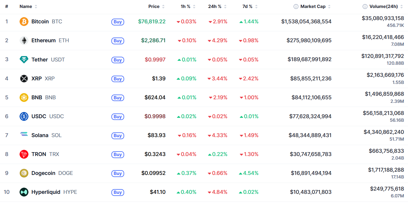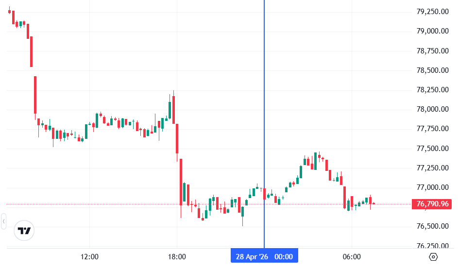 Биткоин (BTC), по данным ресурса TradingView, начал день с бокового движения. По состоянию на 07:37 (МСК), криптовалюта торгуется по $76 790 (1 токен в рублях — ₽5 752 551). Минимум биткоина за 24 часа — $76 481, максимум — $79 159.