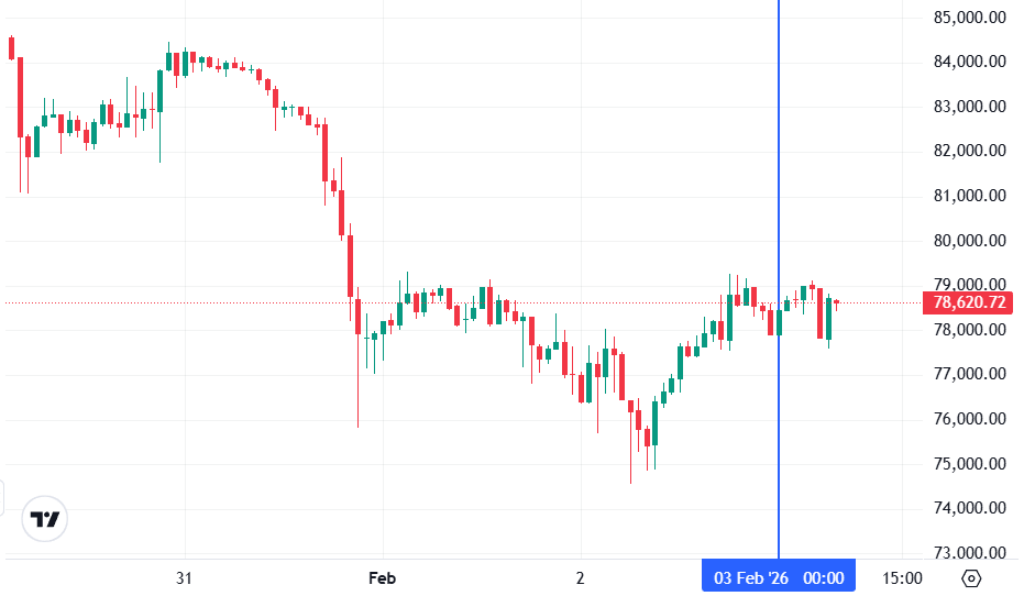 Биткоин (BTC), по данным ресурса TradingView, начал день с бокового движения. По состоянию на 07:30 (МСК), криптовалюта торгуется по $78 620 (1 токен в рублях — ₽6 024 502). Минимум биткоина за 24 часа — $74 844, максимум — $79 258.