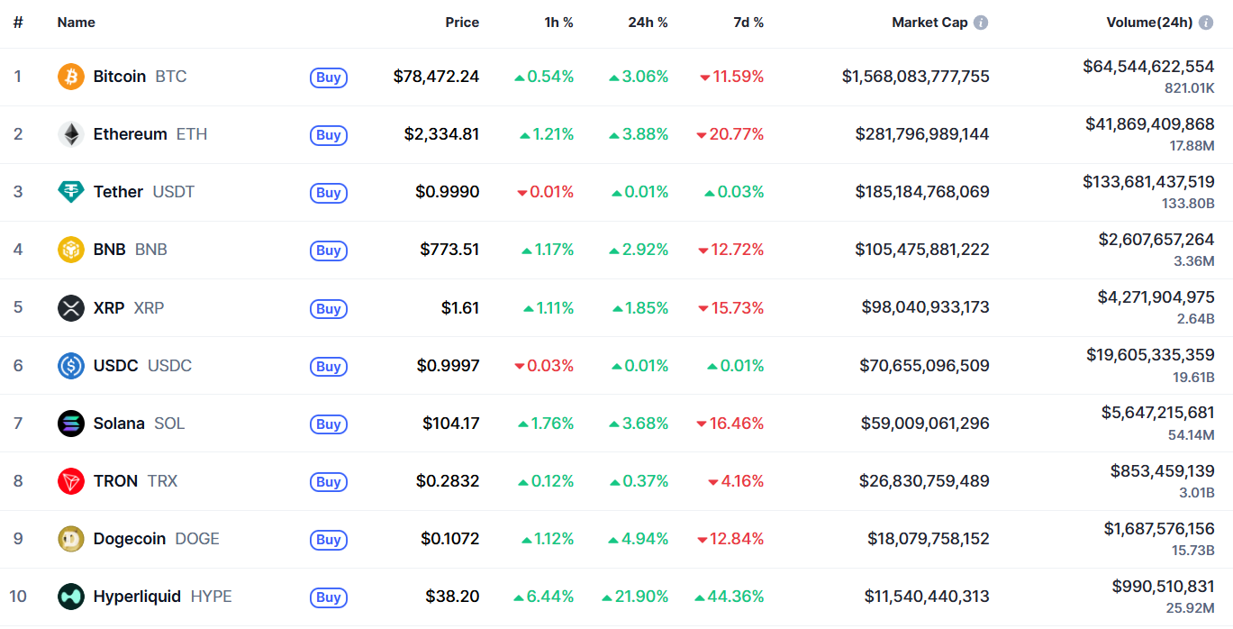 В топ-10 самых капитализированных криптовалют лучший результат за сутки (+21,90%) и неделю (+44,36%) — у Hyperliquid. В течение 24 часов все монеты дорожали. Наибольшие потери за неделю — у Ethereum (-20,77%).