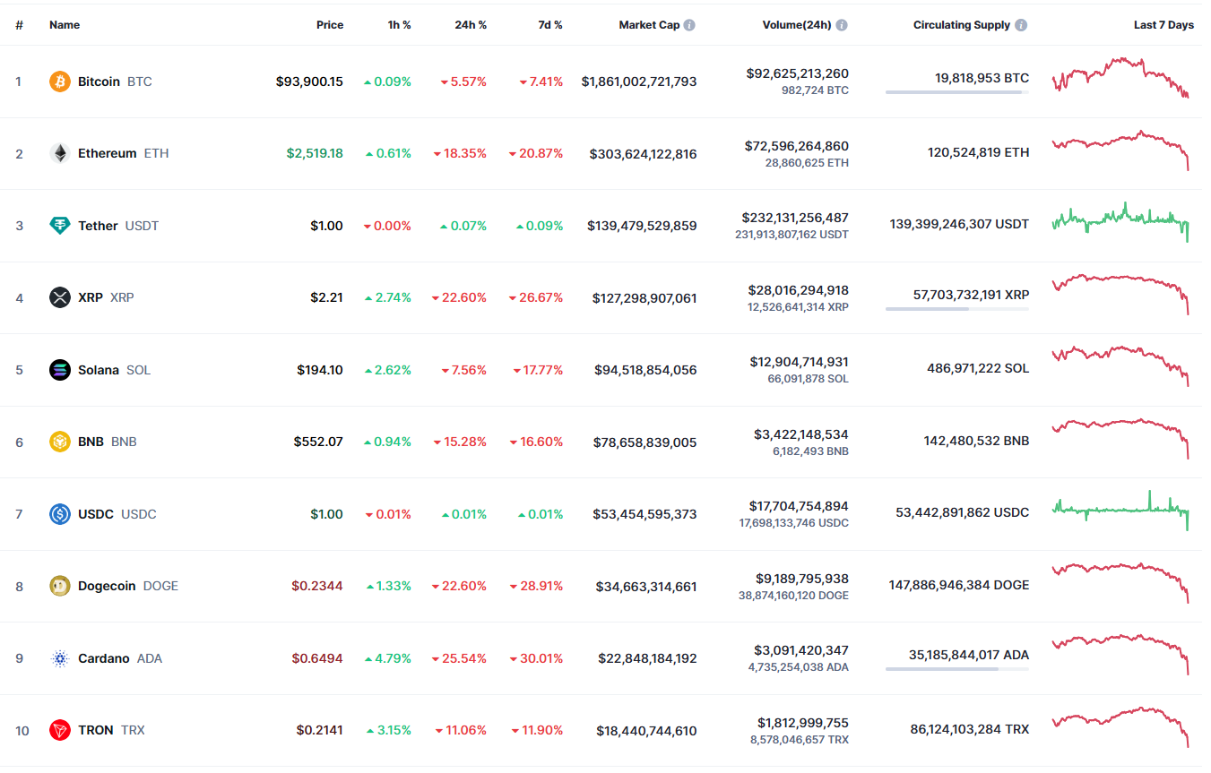 В топ-10 самых капитализированных криптовалют все монеты, за исключением стейблкоинов, падали в течение суток и недели. Наибольшие потери за 24 часа (-25,54%) и семь дней (-30,01%) зафиксированы у Cardano.