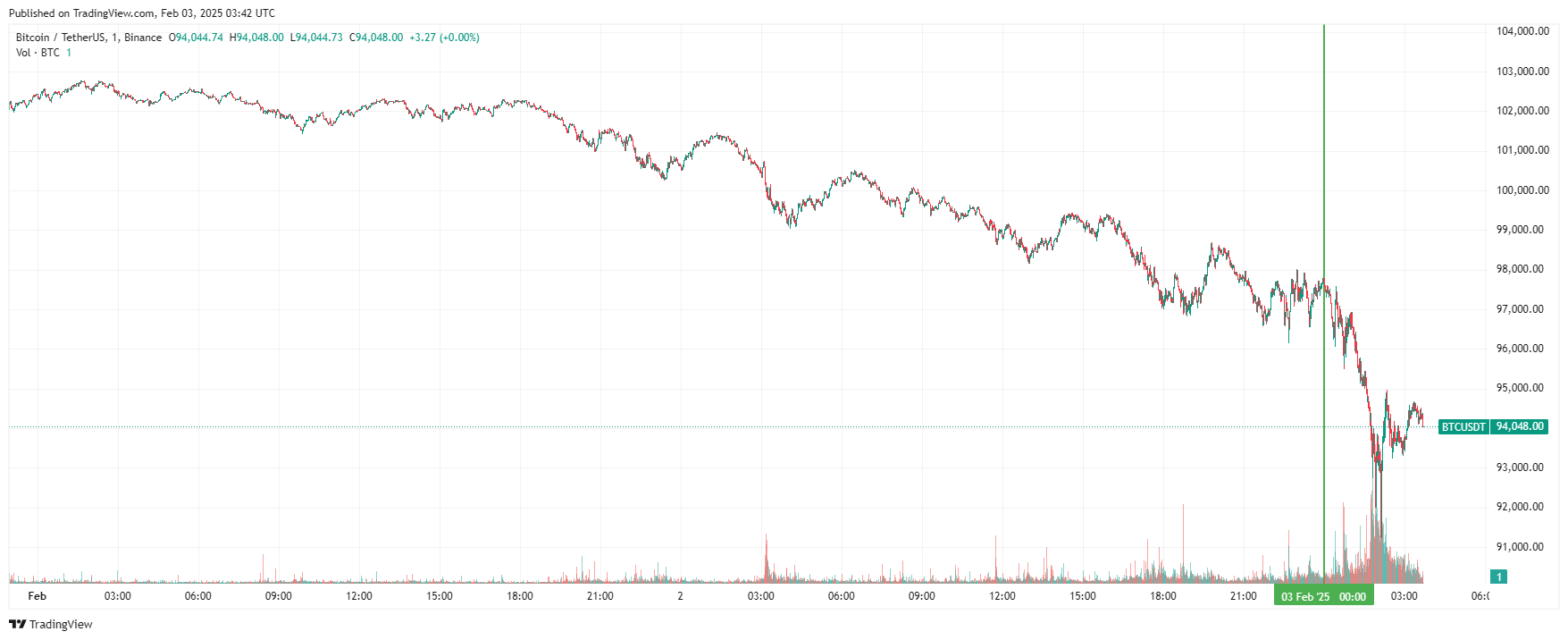 Биткоин (BTC), по данным ресурса TradingView, начал понедельник с падения. По состоянию на 06:43 (МСК), криптовалюта торгуется по $94 048 (1 токен в рублях — ₽9 417 120). Минимум биткоина за 24 часа — $91 242, максимум — $100 485.