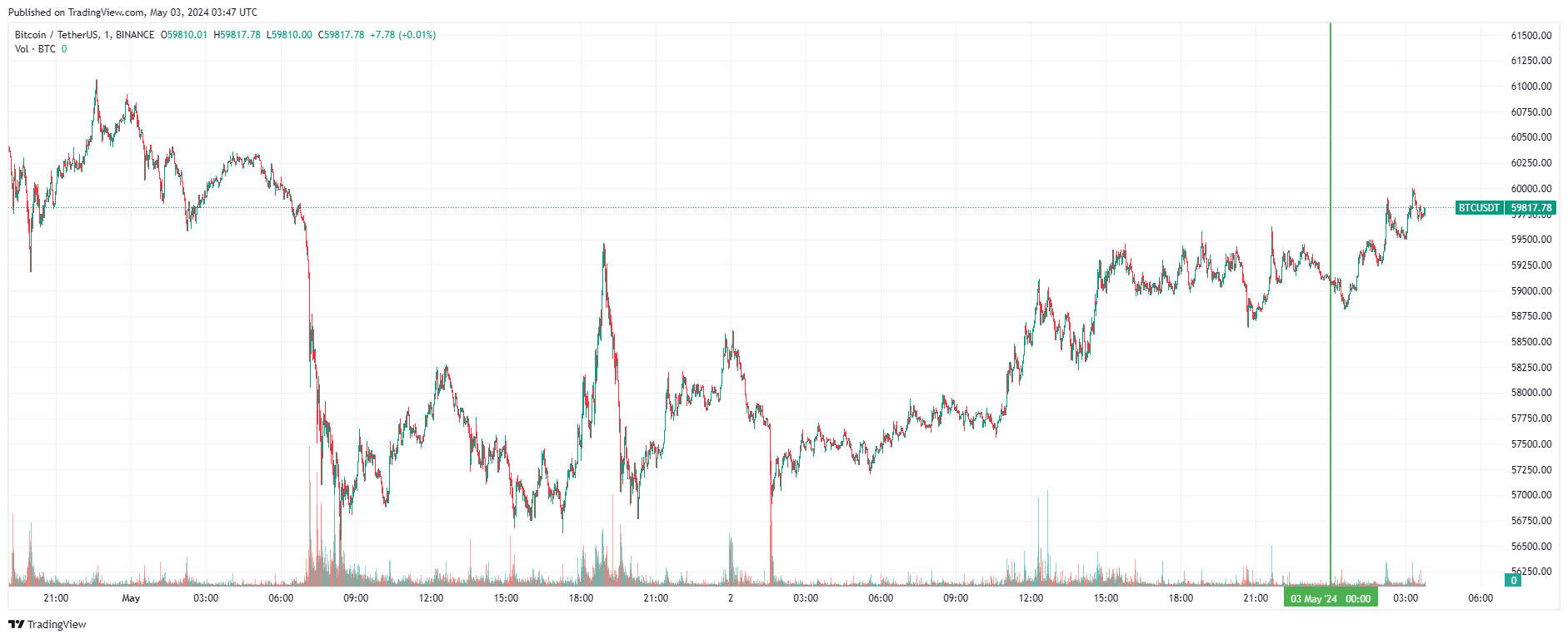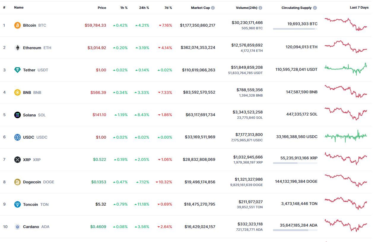 Биткоин (BTC), по данным ресурса TradingView, начал пятницу с роста. По состоянию на 06:47 (МСК), криптовалюта торгуется по $59 817 (1 токен в рублях — ₽5,562,478). Минимум биткоина за 24 часа — $57 186, максимум — $60 004.