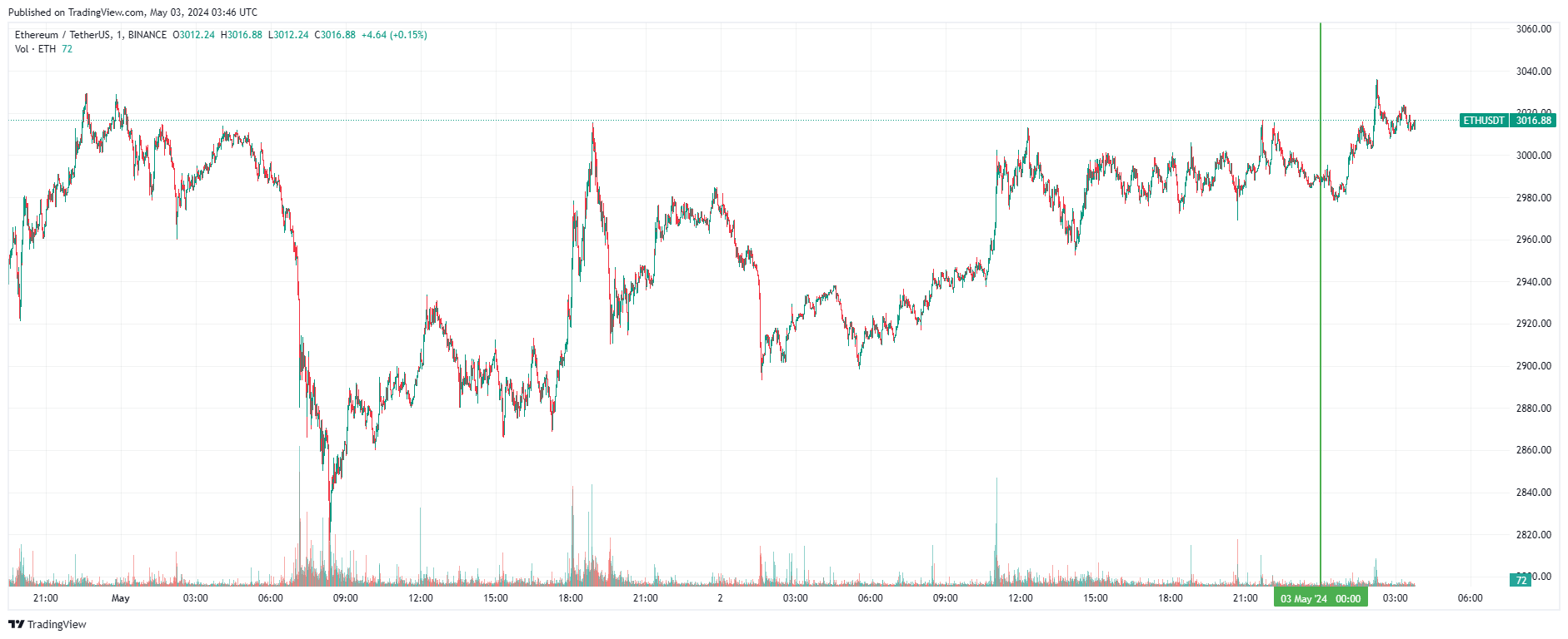 Вторая по капитализации криптовалюта Ethereum также начала день с роста. По состоянию на момент написания обзора, монета торгуется по $3 016 (1 токен в рублях — ₽280,344).
