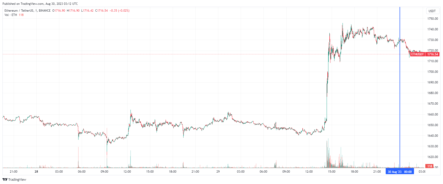 Вторая по капитализации криптовалюта Ethereum также начала день с падения. По состоянию на момент написания обзора, монета торгуется по $1716 (1 токен в рублях — ₽163,827).