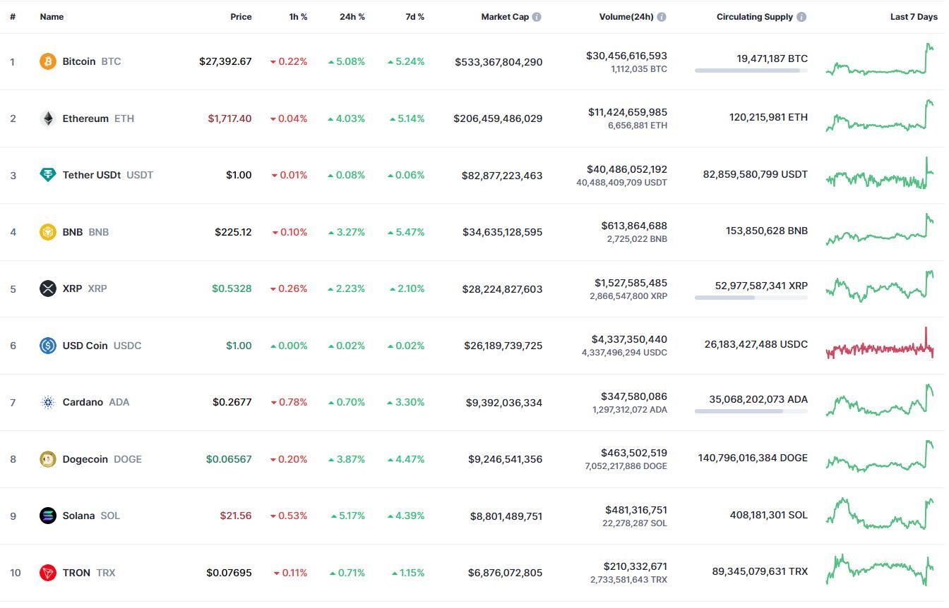 В топ-10 самых капитализированных криптовалют все монеты продемонстрировали позитивную динамику в рамках суток и недели. Лучший результат за 24 часа зафиксирован у Solana (+5,17%). В течение недели активнее других рос BNB (+5,47%).