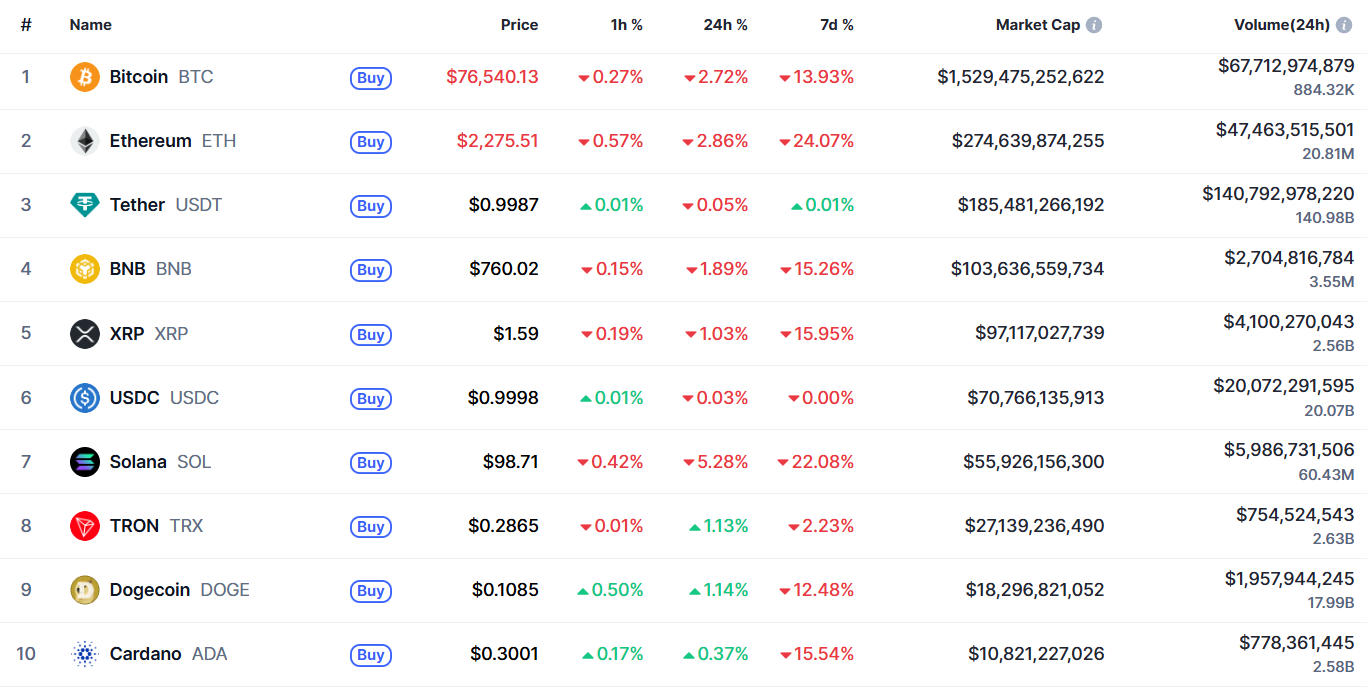 Биткоин (BTC), по данным ресурса TradingView, начал день с бокового движения. По состоянию на 07:30 (МСК), криптовалюта торгуется по $76 588 (1 токен в рублях — ₽5 888 706). Минимум биткоина за 24 часа — $72 897, максимум — $78 974.
