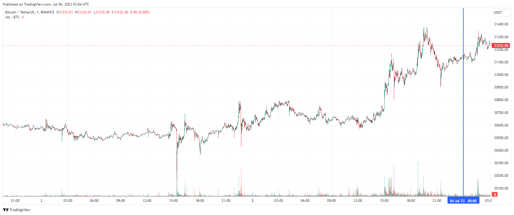 Биткоин (BTC), по данным ресурса CoinMarketCap, начал вторник с роста. По состоянию на 06:05 (МСК), криптовалюта торгуется по $31 232 (1 токен в рублях — ₽2,773,494). Минимум биткоина за 24 часа — $30 586, максимум — $31 375.