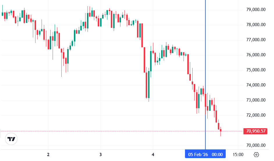 Биткоин (BTC), по данным ресурса TradingView, начал день с падения. По состоянию на 07:17 (МСК), криптовалюта торгуется по $70 950 (1 токен в рублях — ₽5 427 593). Минимум биткоина за 24 часа — $70 740, максимум — $76 697.