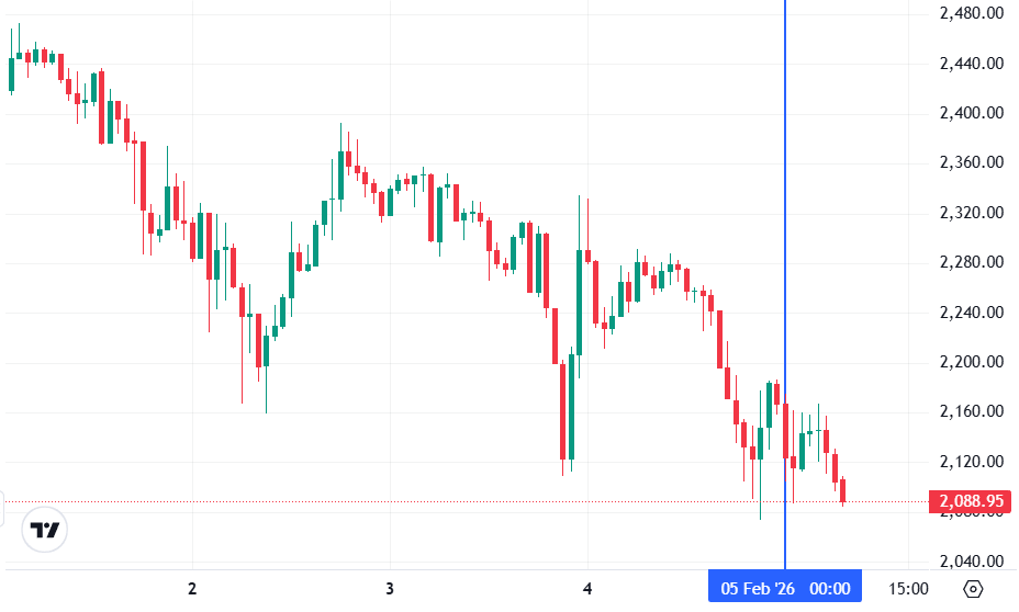 Вторая по капитализации криптовалюта Ethereum также начала день с падения. По состоянию на момент написания обзора, монета торгуется по $2 088 (1 токен в рублях — ₽160 296).