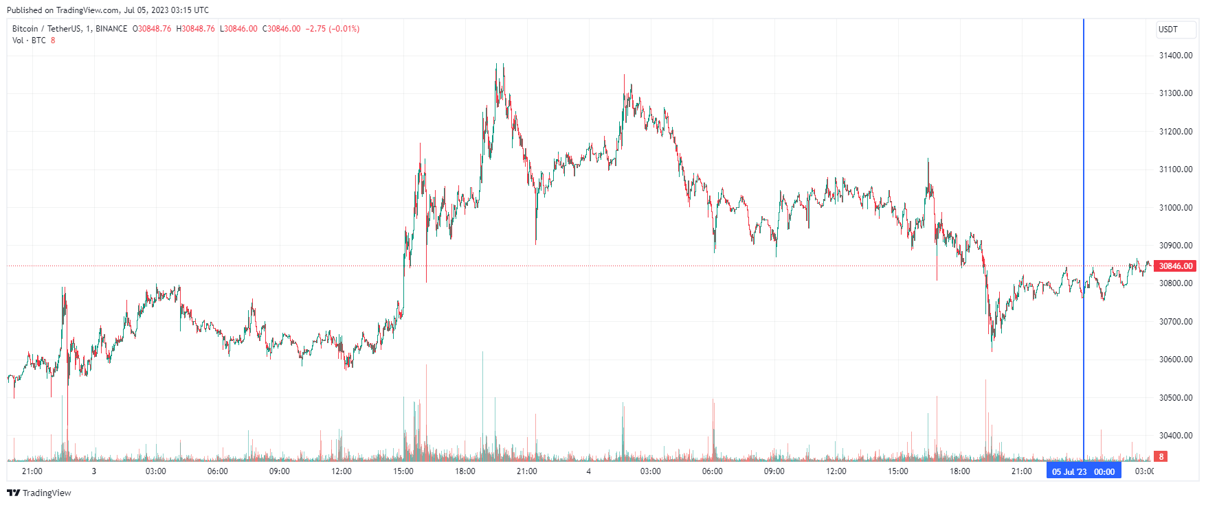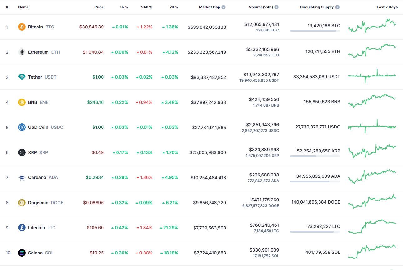 Биткоин (BTC), по данным ресурса CoinMarketCap, начал среду с бокового движения. По состоянию на 06:15 (МСК), криптовалюта торгуется по $30 846 (1 токен в рублях – ₽2,776,555). Минимум биткоина за 24 часа – $30 659, максимум – $31 272.