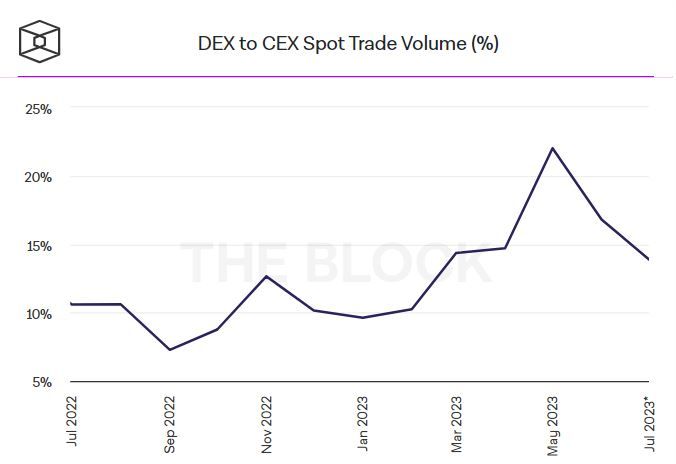 - Трейдеры переходят с децентрализованных криптобирж (DEX) на их централизованные аналоги (CEX). На это указывает сокращение торгового объема первых и рост метрики у вторых. По данным The Block, ежемесячный объем торговых операций DEX по сравнению с CEX в период с мая по июнь снизился с 22% до 16,8%.