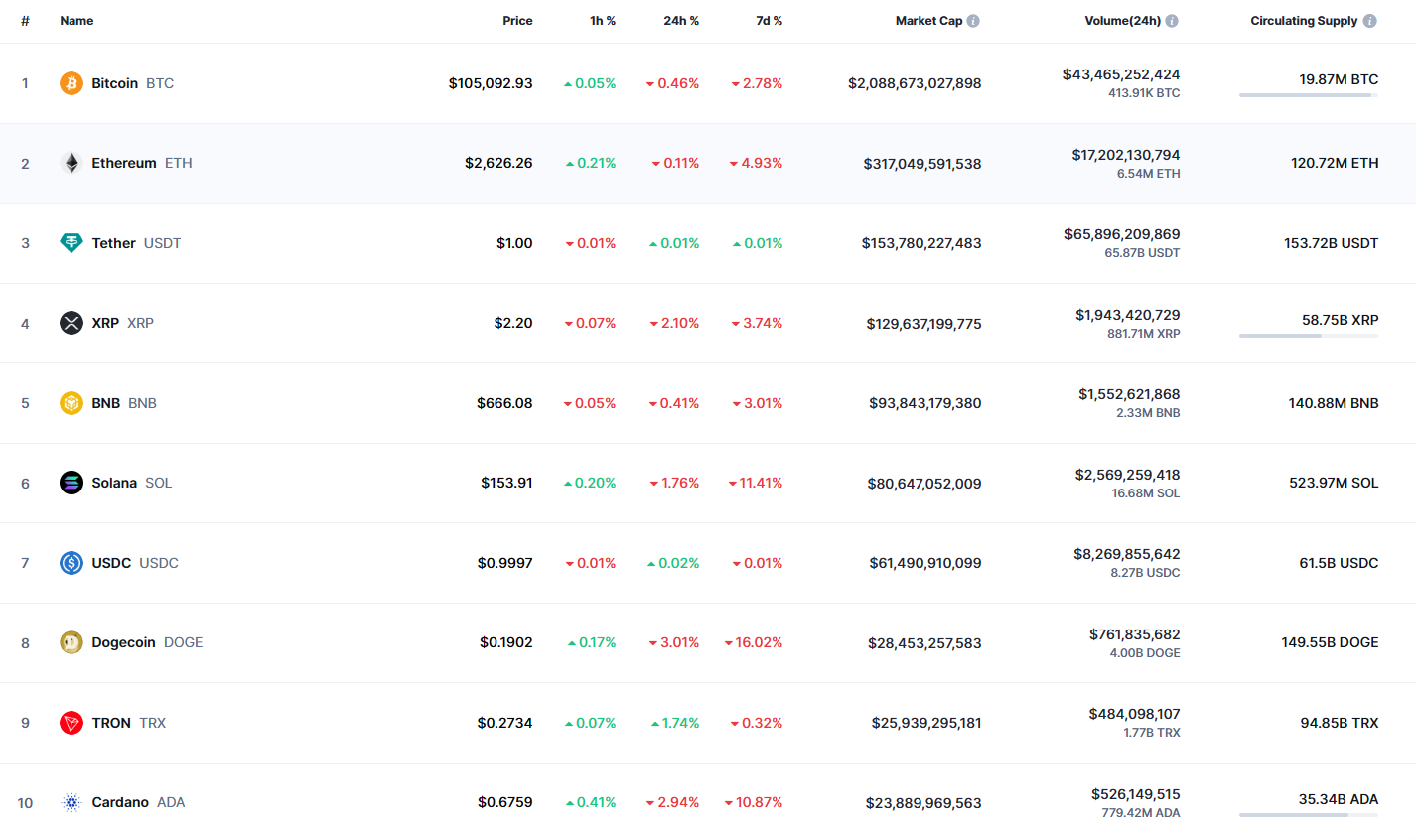 Биткоин (BTC), по данным ресурса TradingView, начал четверг с бокового движения. На момент написания обзора, 06:59 (МСК), криптовалюта торгуется по $105 047 (1 токен в рублях — RUB 8 333 697). Минимум биткоина за 24 часа — $104 232, максимум — $105 997.