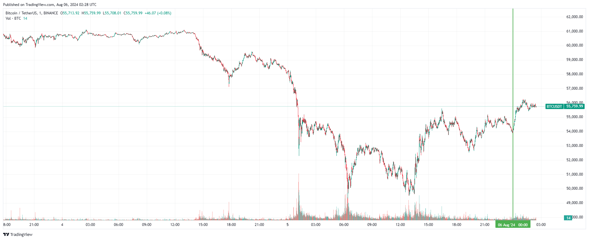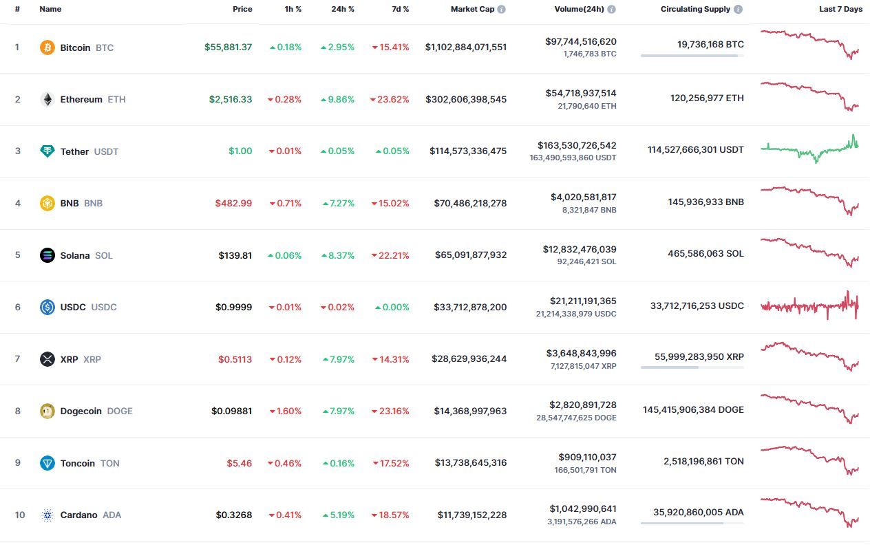 Биткоин (BTC), по данным ресурса TradingView, начал вторник с восстановления после падения. По состоянию на 05:29 (МСК), криптовалюта торгуется по $55 759 (1 токен в рублях — ₽4 779 219). Минимум биткоина за 24 часа — $49 121, максимум — $56 271.