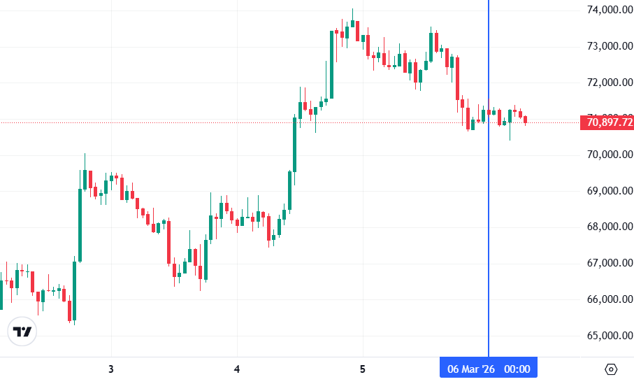 Биткоин (BTC), по данным ресурса TradingView, начал день с бокового движения. По состоянию на 07:37 (МСК), криптовалюта торгуется по $70 897 (1 токен в рублях — ₽5 542 315). Минимум биткоина за 24 часа — $70 398, максимум — $73 555.