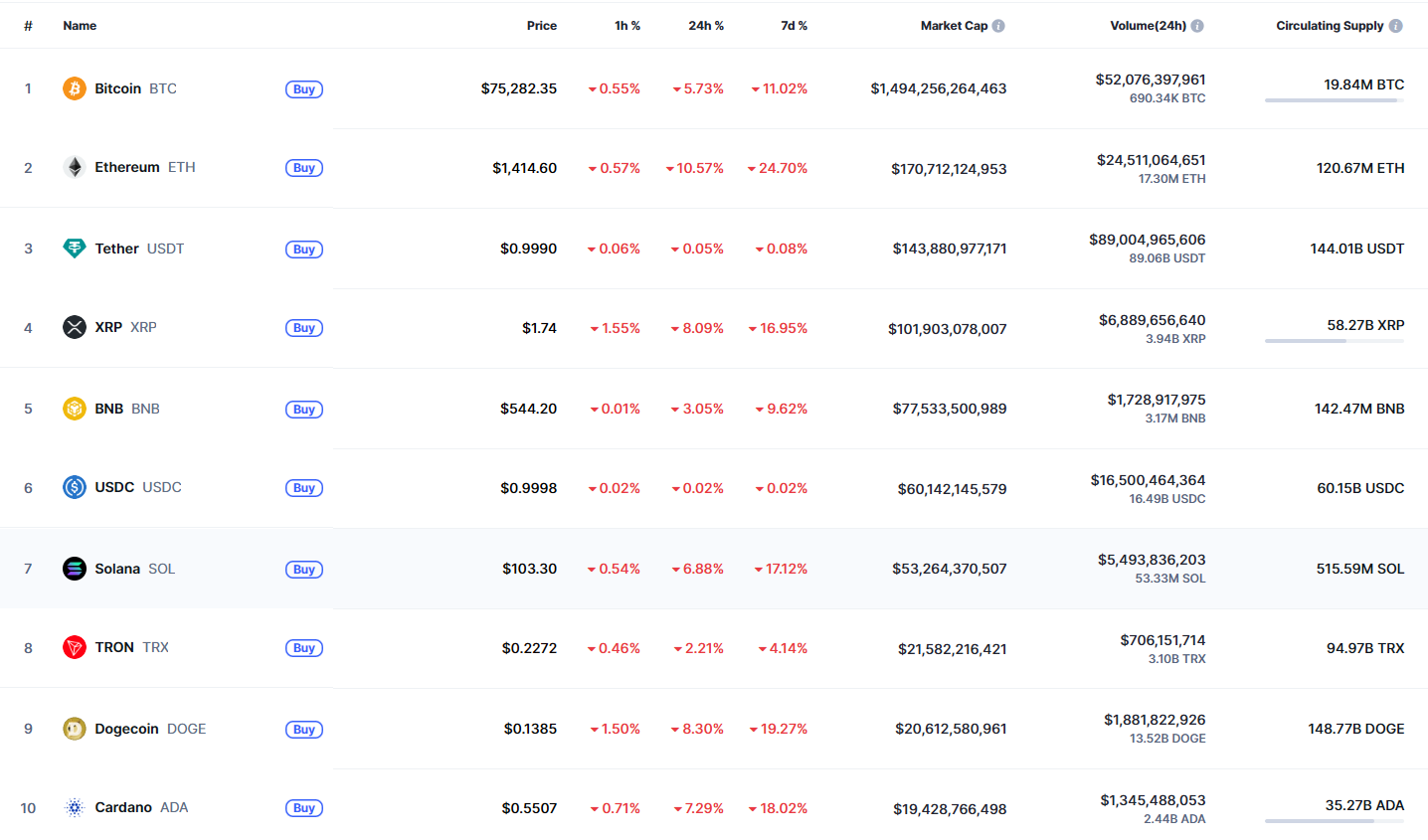 Биткоин (BTC), по данным ресурса TradingView, начал среду с падения. По состоянию на 06:49 (МСК), криптовалюта торгуется по $75 483 (1 токен в рублях — RUB 6 452 157). Минимум биткоина за 24 часа — $74 589, максимум — $80 379.