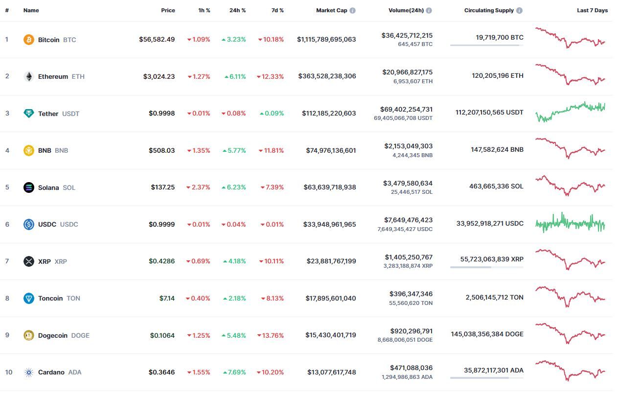 В течение 24 часов в топ-10 самых капитализированных криптовалют все монеты, за исключением стейблкоинов, продемонстрировали позитивную динамику. Лучший результат зафиксирован у Cardano (+7,69%). В течение недели все монеты, за исключением стейблкоина Tether, продемонстрировали отрицательную динамику. Наибольшие потери за семь дней зафиксированы у Dogecoin (-13,76%).