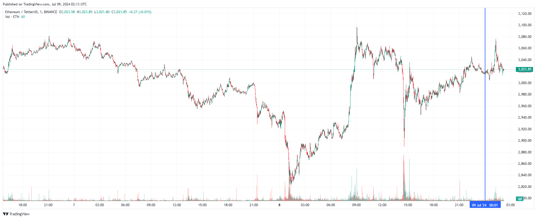 Вторая по капитализации криптовалюта Ethereum также начала день с бокового движения. По состоянию на момент написания обзора, монета торгуется по $3 023 (1 токен в рублях — ₽266 948).
