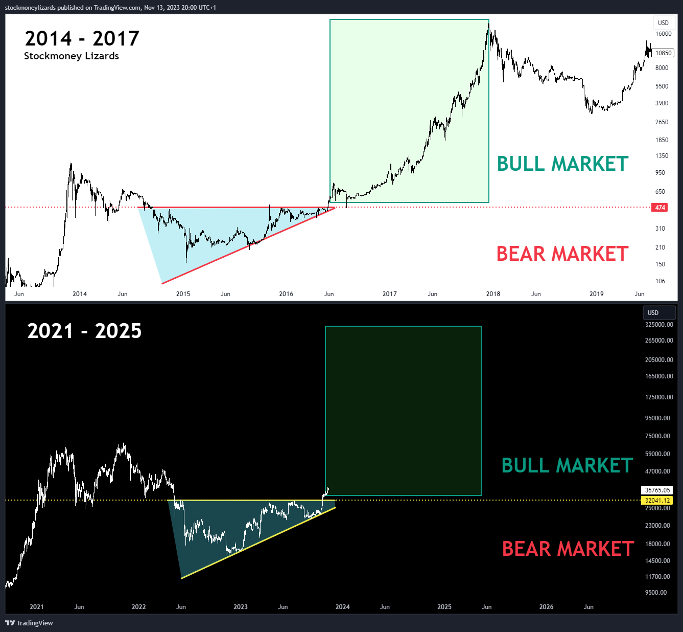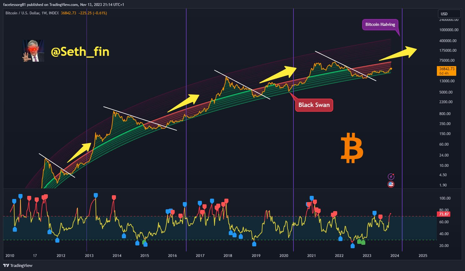 Переходим к следующему «прогнозу для тещи». Его автор также использовал теорию цикличности рынка. Также он обозначил на графике схожие паттерны поведения монеты. Предполагаемое направление движения курса BTC обозначено стрелочками. Если продолжить верхнюю границу предполагаемого автором канала, она уткнется в $1 млн. На этом моменте начинают меркнуть прогнозы, согласно которым биткоин подрожает до $400 тыс. на фоне халвинга 2024.