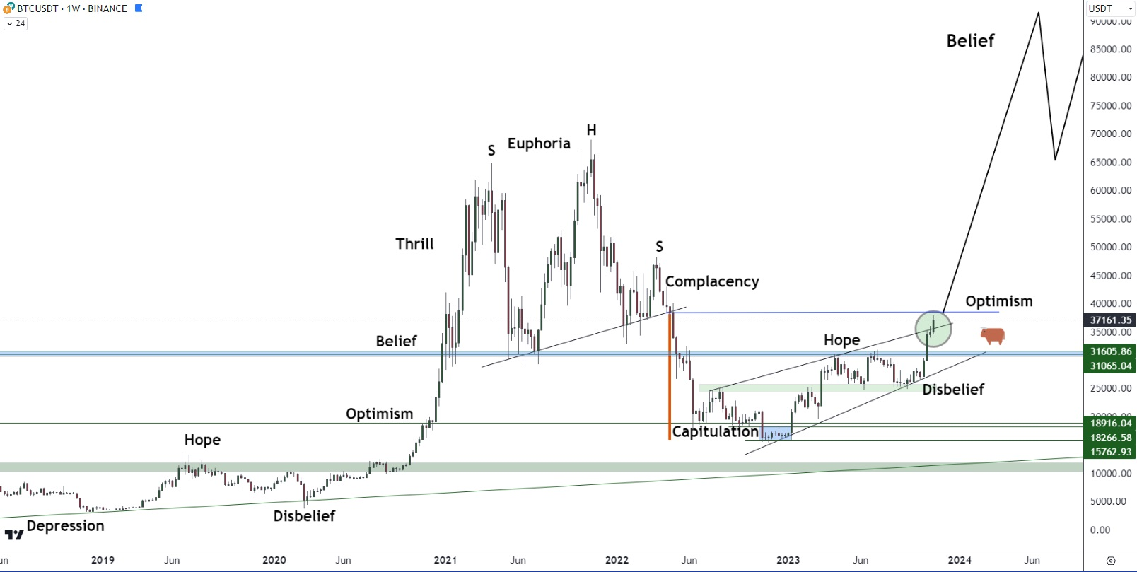 Автор следующего прогноза использовал психологию рыночных циклов. Ее «наложение» на график BTC позволило предположить, что биткоин может встретить халвинг 2024 гдето-в районе $80-90 тыс. За всю историю наблюдений биткоин ни разу не обновлял абсолютный максимум стоимости в преддверии халвинга или сразу после него. Событие запускает циклы роста, на фоне которых монета устанавливает новый пик, примерно, спустя полтора года. Автор «прогноза для тещи», который представлен ниже, считает, что на этот раз все будет куда лучше, чем в предыдущих циклах.