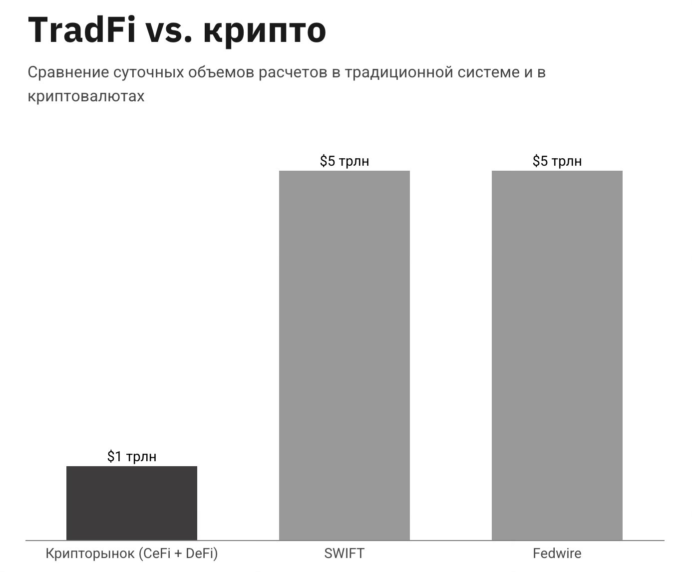 Суточные обороты крипторасчетов (CeFi плюс DeFi) уже могут превышать $1 трлн, и они продолжают расти. По факту они уже сопоставимы со среднесуточными оборотами в в системе денежных переводов ФРС Fedwire и в системе SWIFT (около $5 трлн). В результате создается параллельная глобальная финансовая расчетная система, в которой доллар будет лишь «якорем», а расчетная ликвидность сможет «уходить» в токенизированные активы.