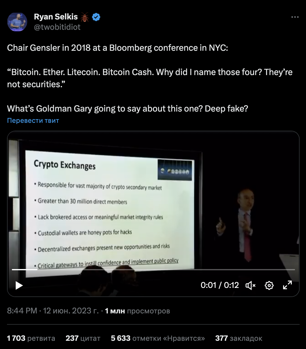 Участники криптосообщества тем временем вовсю обсуждают старые видео с участием Генслера, на которых он утверждает, что Ethereum, наравне с биткоином, Bitcoin Cash (BCH) и Litecoin (LTC), не относятся к ценным бумагам.