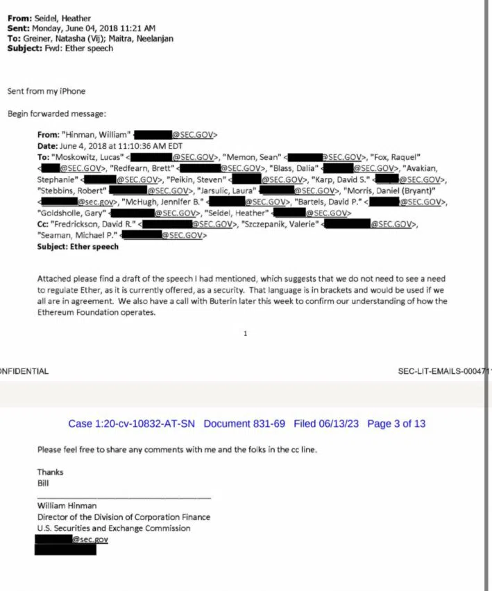 Предположения JPMorgan основаны на публикации так называемых «документов Хинмана». В 2018 году директор Отдела корпоративных финансов SEC Билл Хинман заявил, что Ethereum достаточно децентрализован и не подходит под определение ценной бумаги в соотвествии с тестом Хауи. Позицию по этому вопросу он изложил в электронном письме, которое отправил 17 адресатам в Комиссии.