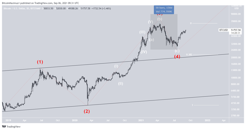 В более долгосрочной перспективе волновой анализ предполагает, что циклическая волна четыре (красный цвет) завершилась. В этом случае BTC уже начал пятую, заключительную волну цикла.