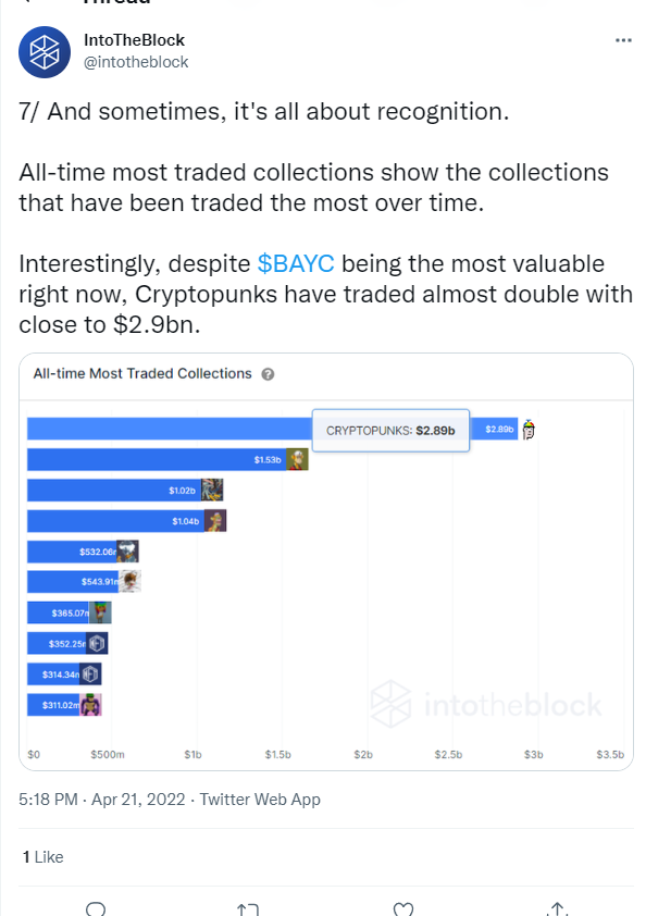 SponsoredВсего же с мая 2021 года участники NFT-рынка успели наторговать свыше $53 млрд. За этот же промежуток времени рынок сформировал более 76 000 коллекций невзаимозаменяемых токенов. Наиболее дорогой по среднему ценнику NFT коллекцией оказалась сборка не CryptoPunks, а BAYC.