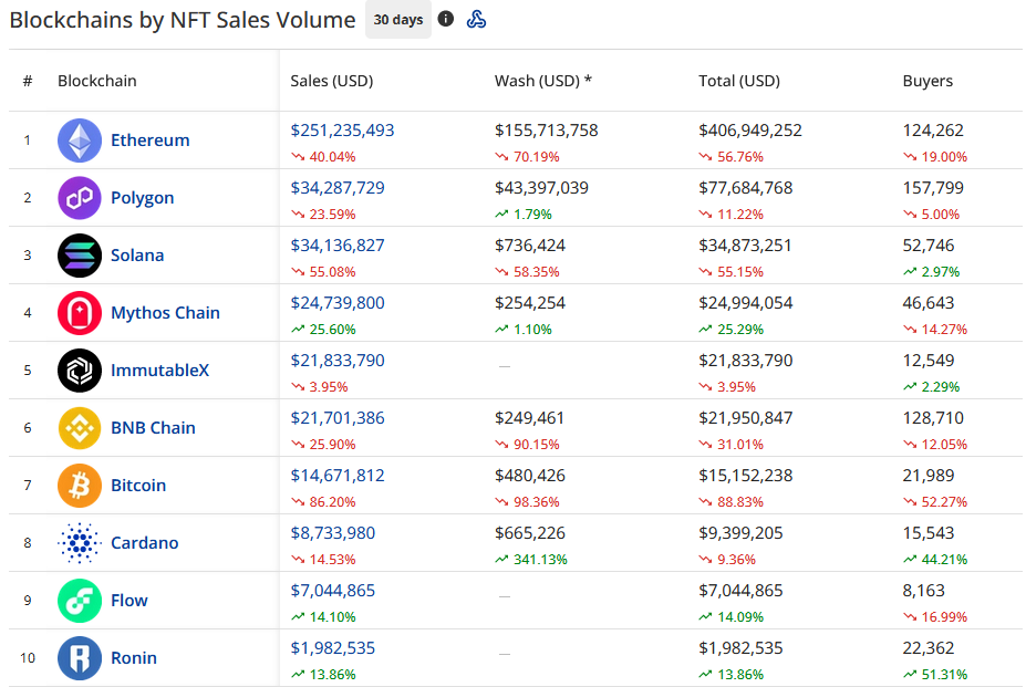 В настоящее время сеть Биткоин занимает 7 место по объему продаж NFT за последние 30 дней.