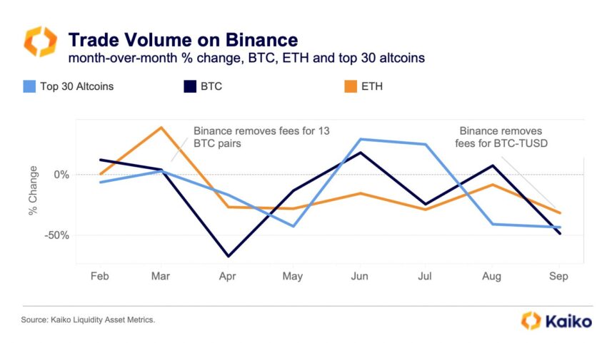 За последний месяц объем торгов биткоином в паре BTC/USDT на Binance снизился на 48%. К такому выводу пришли аналитики Kaiko.