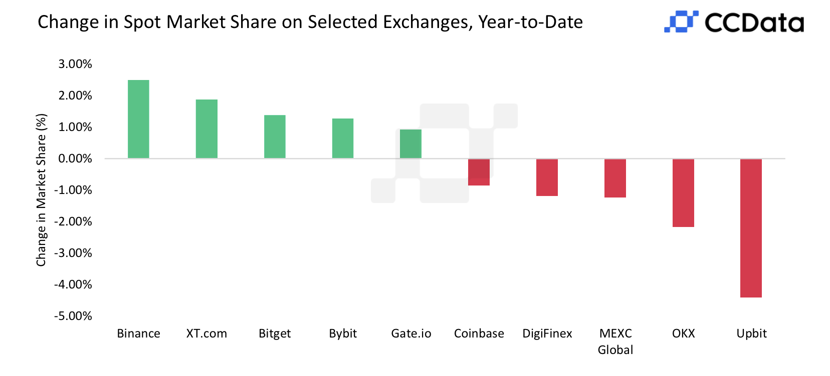 Позицию крупнейшей спот-биржи сохранила Binance с долей рынка в 34,6%. Тем не менее объемы сократились на 19,8% до $545 млрд. Успехов также добились XT.com, Bitget и Bybit, которые увеличили свои доли. Наибольшее снижение продемонстрировали Upbit, OKX и MEXC.