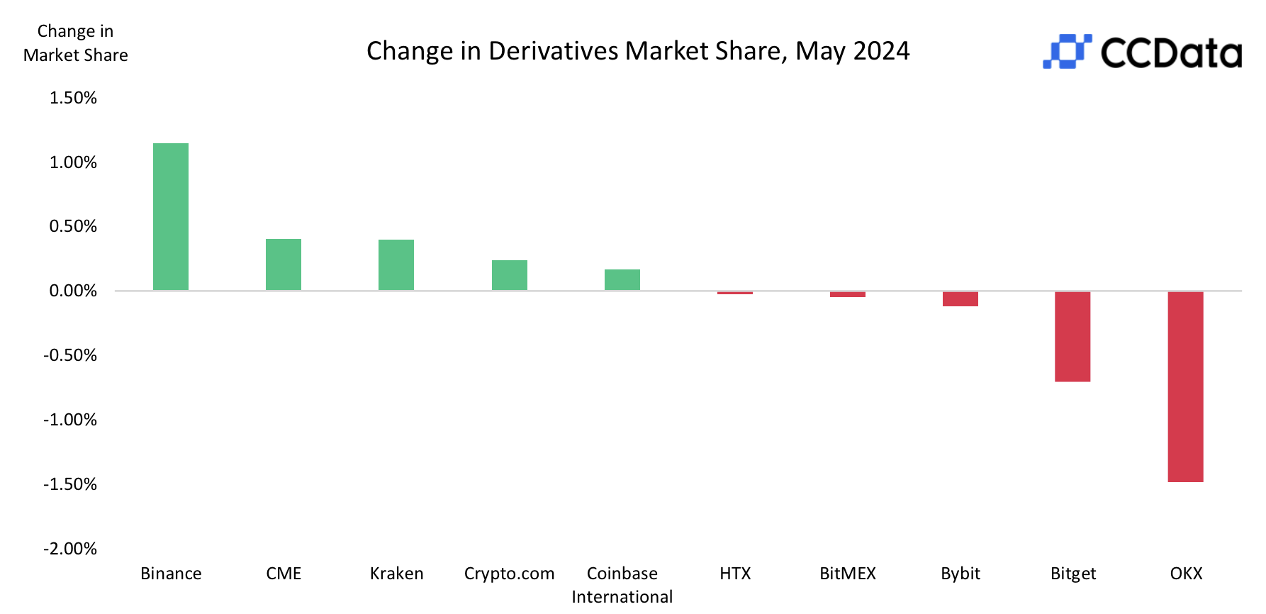 Kraken и Crypto.com стали самыми результативными биржами деривативов по изменению объема торгов за месяц, зафиксировав рост на 20,2 % и 3,63 % до $44,7 млрд и $39,9 млрд соответственно.