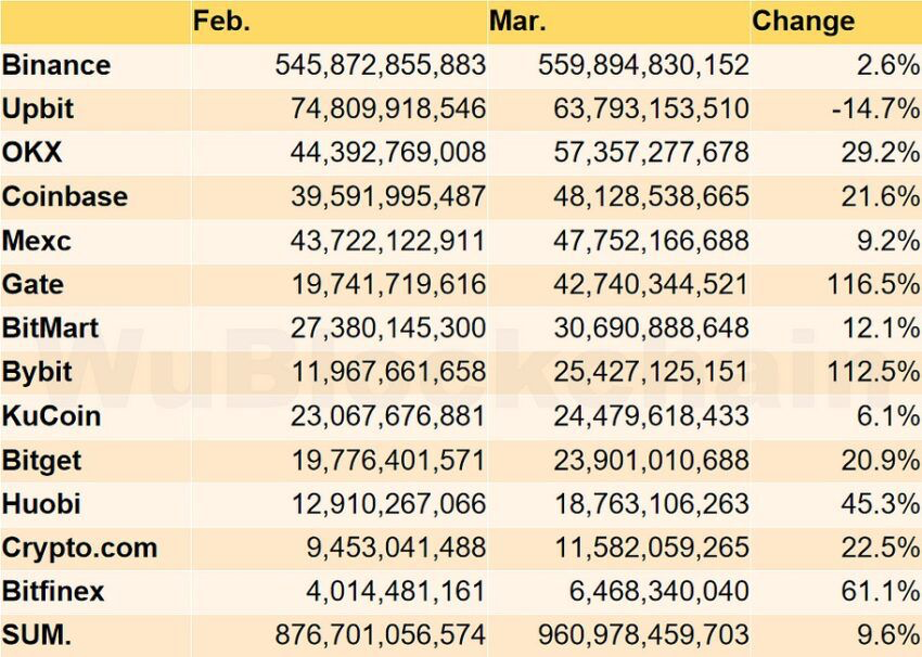 Криптовалютный рынок набирает обороты. Согласно данным Wu Blockchain, в марте объем торгов деривативами на крупнейших биржах вырос почти вдвое — на 46,8%, а объем спотовой торговли — на 9,6%. И то, и другое свидетельствует о бычьем настрое инвесторов и возрождению интереса к цифровым активам.