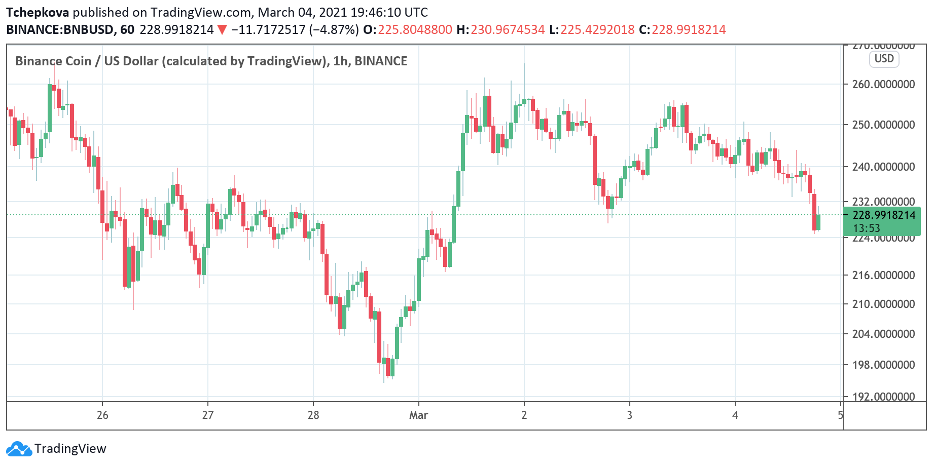 Собственный токен биржи, Binance Coin (BNB), за последний месяц подорожал более чем в восемь раз. Цена выросла на 729%, с $44,37 первого февраля до $368 девятнадцатого февраля. Несмотря на коррекцию до $240, растущий спрос на монету поможет ей закрепиться в русле восходящего тренда.