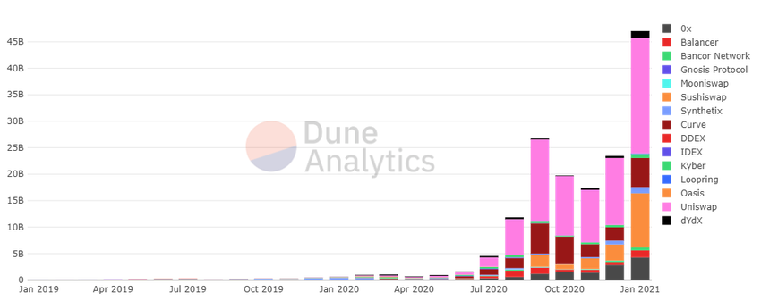 За это время платформы DEX прошли большой путь развития. В январе 2019 года работало пять активных бирж. Более 70% рынка контролировала IDEX. Ежемесячный объем торгов на этой площадке достигла 34 млн долларов, остальное делили между собой Uniswap и Kyber.