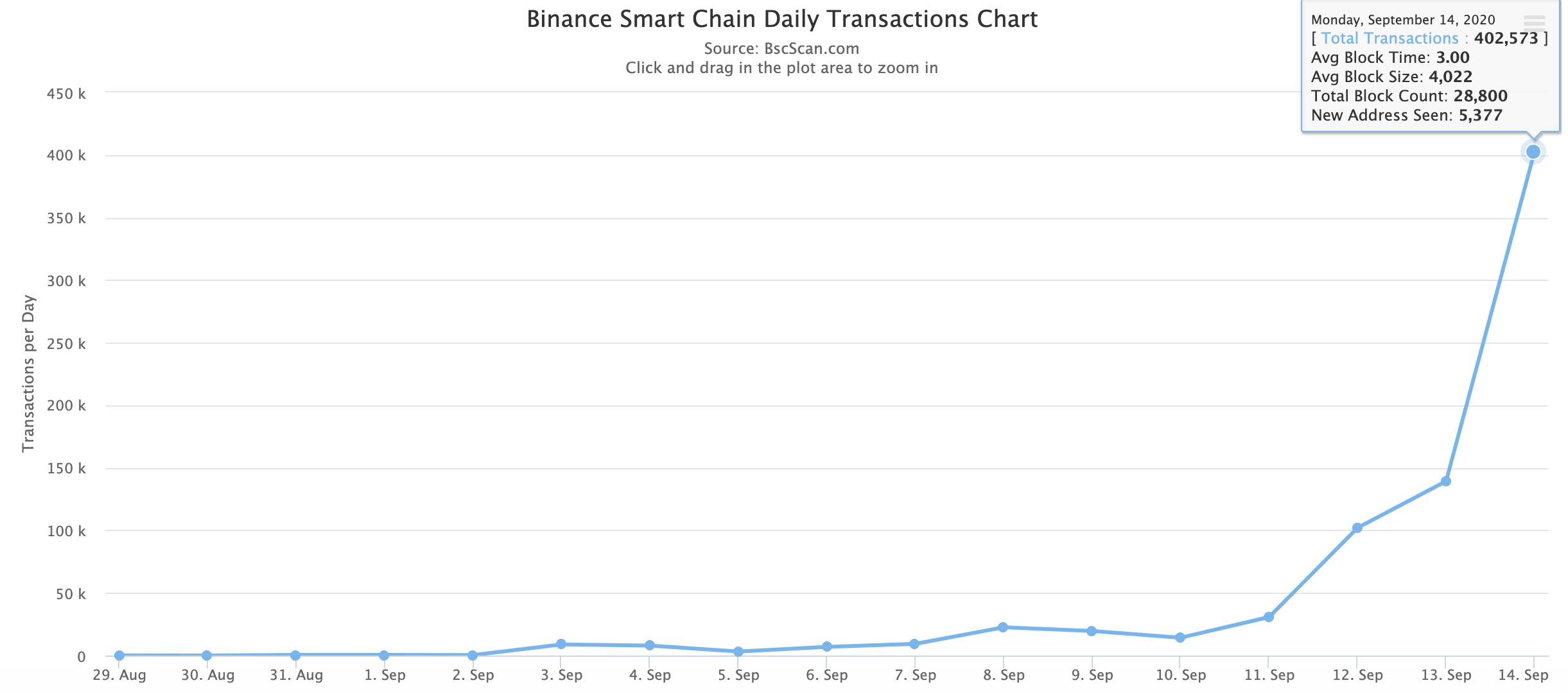 По словам СЕО криптовалютной биржи Binance и платформы Binance Smart Chain, всего за несколько дней после запуска BSC количество транзакций в день превысило 400 тыс.