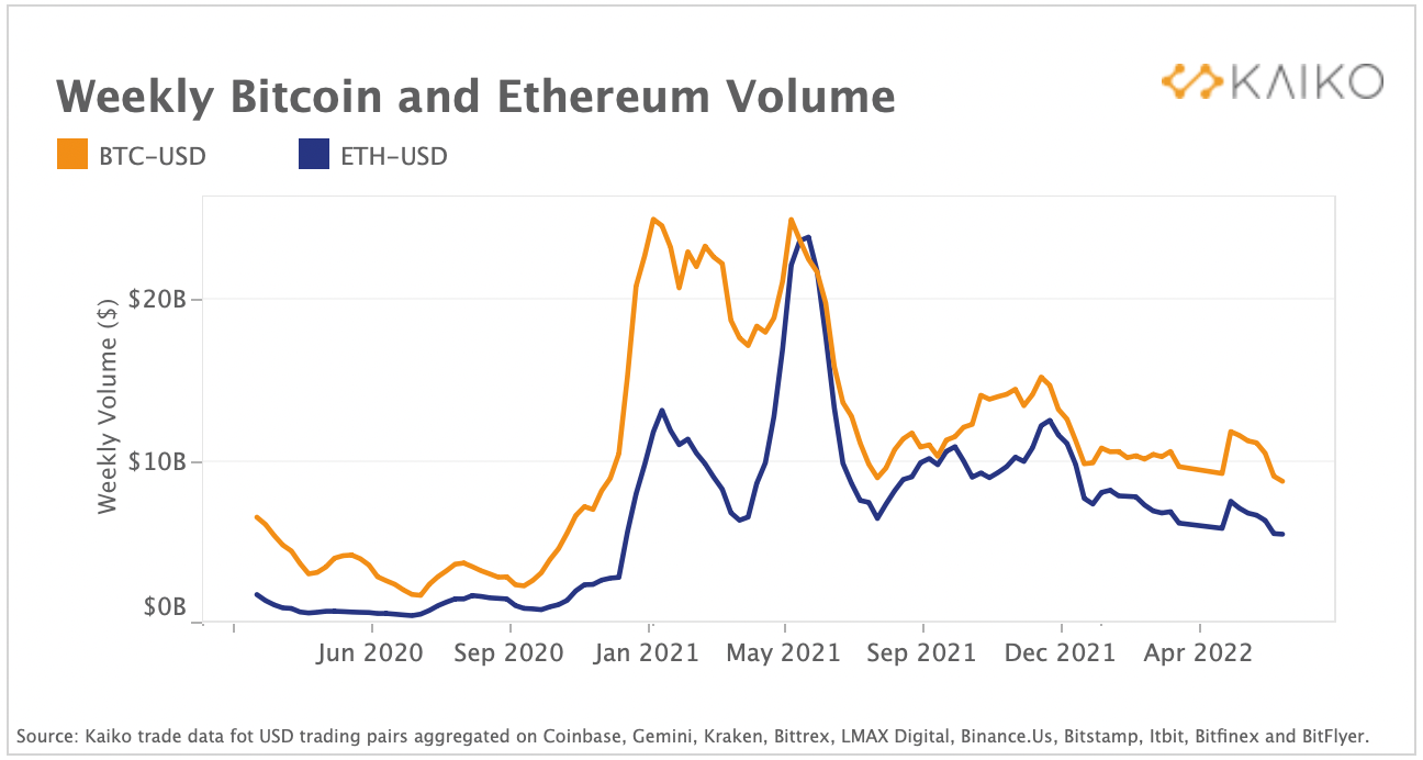 Еженедельные объемы торгов биткоином (BTC) и ether (ETH) значительно снизились с начала года и теперь находятся ниже уровней начала 2021 года. Об этом у себя в рассылке сообщили аналитики Kaiko.