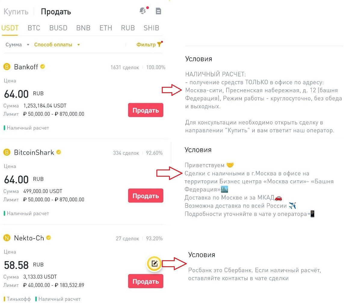 В подавляющем большинстве объявлений речь идет об обмене криптовалюты на наличные рубли. Предложений о продаже USDT за физические доллары на P2P-платформе Binance, по состоянию на момент написания материала, нет. Во многом, поэтому предложение уличных «менял» выглядит таким привлекательным.