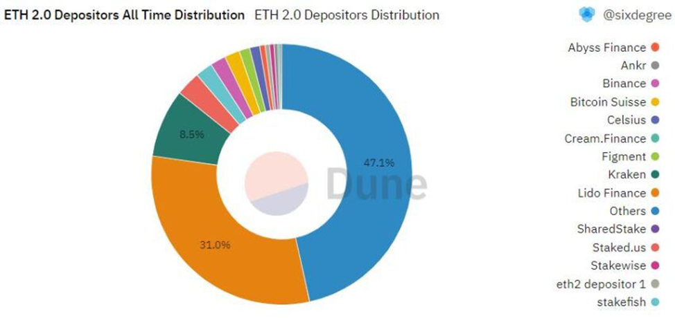 Речь идет о хорошо известных криптогигантах: Lido Finance, Coinbase, Kraken и Binance. Вместе они держат около 62% от всех размещенных на стейкинге токенов Ethereum. Только на Lido приходится треть всех размещенных ETH. Это проиллюстрировано на рисунке ниже: