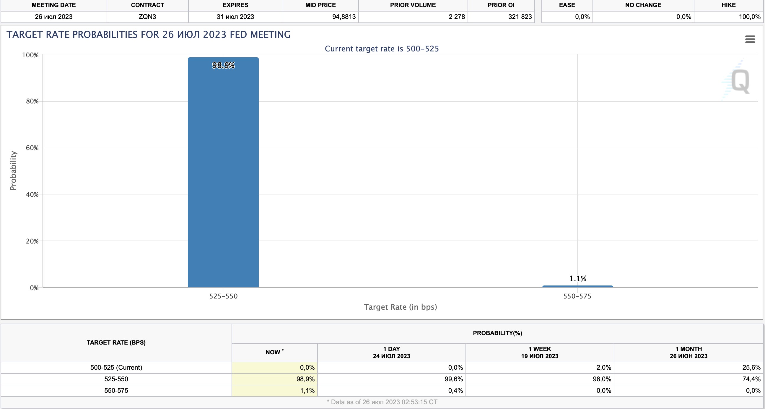 По данным инструмента CME FedWatch, большинство участников рынка (99,8%) ожидают повышения ставки на 25 базисных пунктов. Однако настоящая интрига заключается в том, что произойдет после этого шага и будет ли он означать конец цикла повышения ставок.
