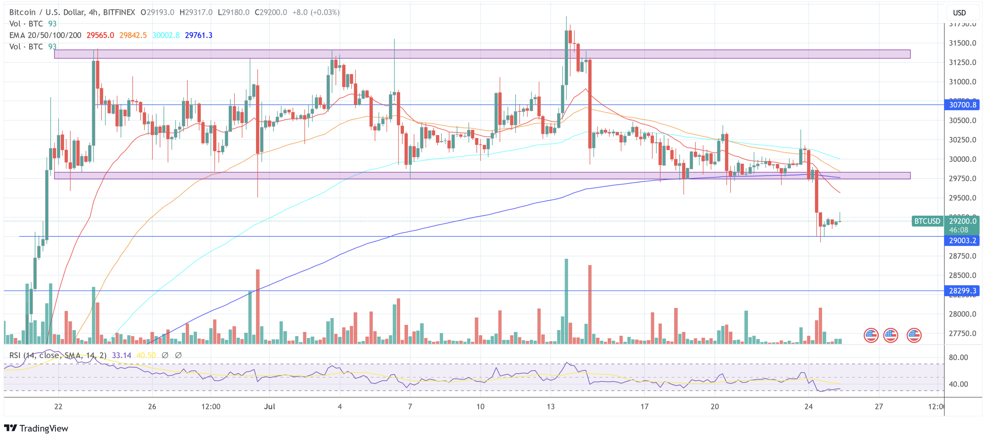 Кроме того, бычий импульс, который привел BTC к новому годовому максимуму, практически сошел на нет: в понедельник цена главной криптовалюты ненадолго опустилась ниже отметки $29 000, сигнализируя о потенциальном всплеске волатильности на фоне решения Комитета.