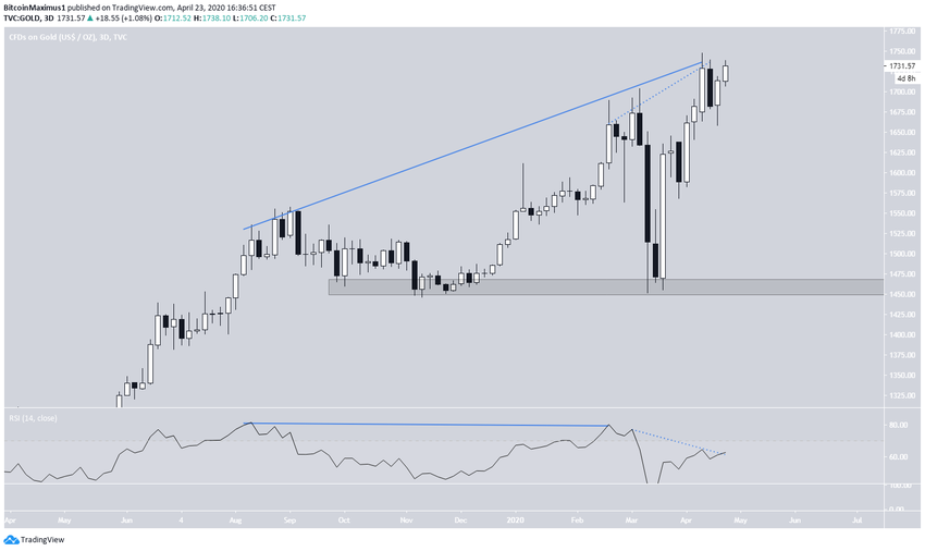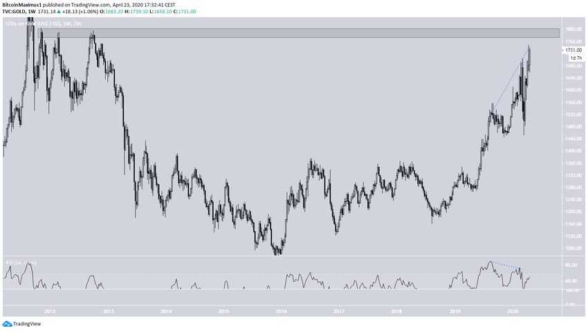 Давайте взглянем на графики золота и попробуем разобраться, грозит ли ему снижение. Недавно мы уже анализировали корреляцию цен на биткоин и нефть, поэтому сейчас сосредоточимся на сравнении динамики золота и BTC.